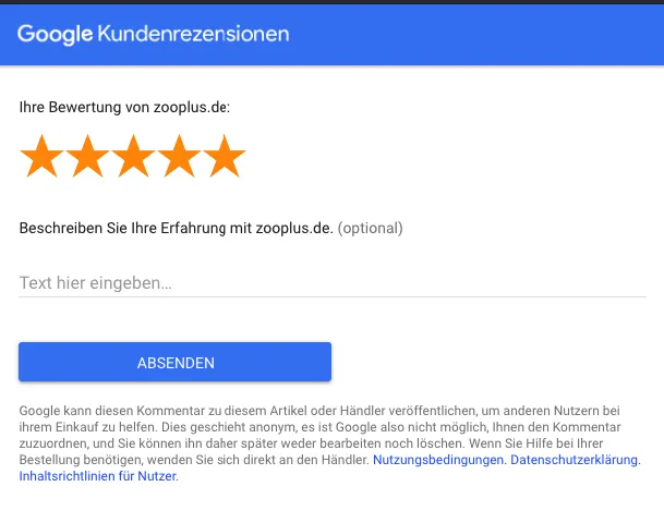 Es gibt eine Moeglichkeit, ohne Anmeldung und anonym Online-Shops bei Google zu bewerten. Dabei handelt es sich um ein gesondertes System: Google Kundenrezensionen. Dieses Google Produkt ist nur fuer Online-Shops relevant. Dort gesammelte Bewertungen werden auch nicht bei lokalen Suchen angezeigt, sondern helfen nur bei Google Shopping Anzeigen. Google kann durch die Integration in das Shopsystem sicherstellen, dass kein Schindluder mit Fake-Bewertungen betrieben wird.