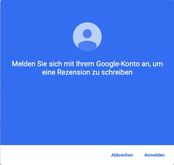 Kunden wuerden Ihr Geschaeft gerne bewerten, aber es gibt eine Huerde: Um eine Bewertung bei Google abzugeben, muessen sie bei Google angemeldet sein. Manche Kunden, insbesondere iPhone-Nutzer, haben aber kein Google-Konto oder sind nicht automatisch eingeloggt. Sie erhalten dann diese Meldung, die meist dazu fuehrt, dass der Kunde nicht bewertet: