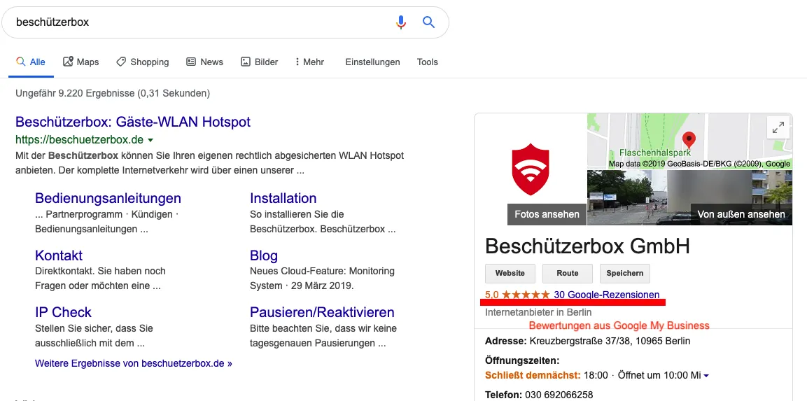 Bei einer Brand-Suche, also einer direkten Suche nach dem Namen des Geschaefts, erscheinen meist auch die Sterne aus dem Google My Business Profil. Hier ein Beispiel: