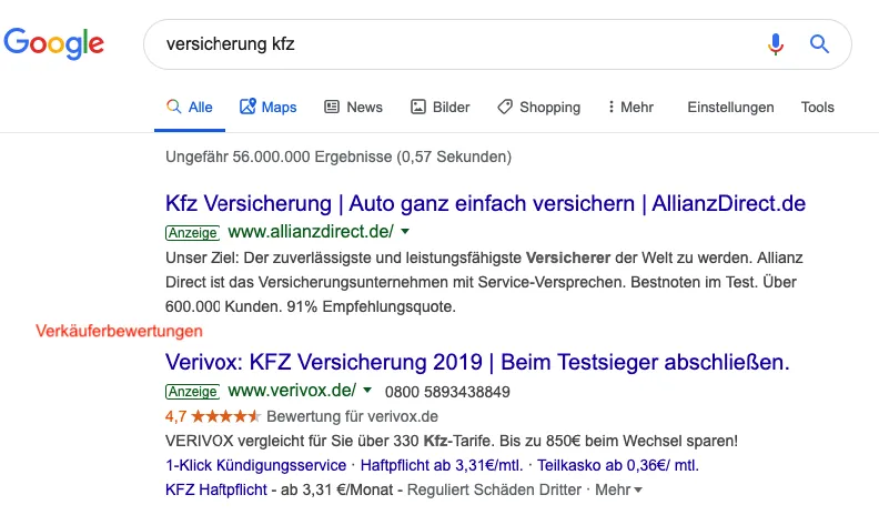 Diese Sterne, die in den Google Ads angezeigt werden, habe sogenannte Verkaeuferbewertungen als Grundlage. Wir erklaeren weiter unten, wie man bei den Verkaeuferbewertungen teilnehmen kann.