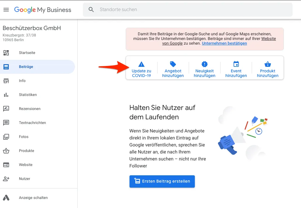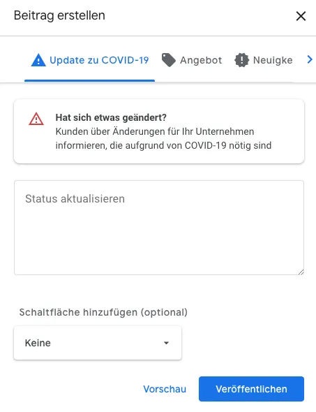 Als nächsten Schritt können Sie auch noch einen Beitrag bei Google zu Ihrem Unternehmen veröffentlichen, um z.B. zu zeigen welche Hygiene-Maßnahmen in Ihrem Geschäft gelten. Google hat dafür extra eine neue Beitragskategorie angelegt.