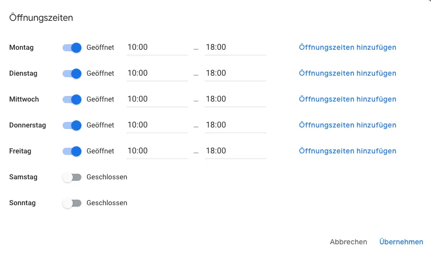 - Ändern Sie die Öffnungszeiten, falls diese anders sind, ansonsten klicken Sie einfach auf Übernehmen.