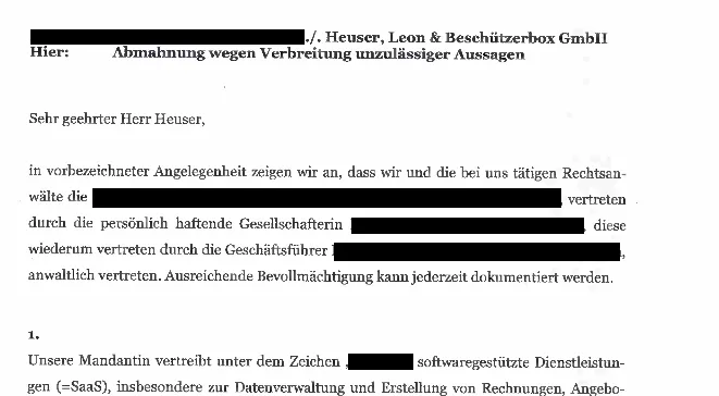 Ein Jahr lang tat sich nichts, ausser, dass wir den Umstieg auf eine alternative Softwareloesung vorbereiteten. Dann flatterte ein Brief einer Kanzlei des besagten Software-Unternehmens in mein Buero: eine Abmahnung! Die Kanzlei war sehr gruendlich mit meiner Bewertung. So verfestigte man sich darauf, dass die verstrichene Zeit, die die Suchfunktion brauche um zu funktionieren, 7 Sekunden zu hoch angesetzt sei. Man unterstellte mir somit die Verbreitung falscher Tatsachen.