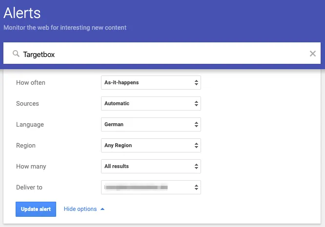 Google Alert (empfohlen) Das wahrscheinlich meistgenutzte Tool fuers Brand Monitoring. Google Alert ist kostenfrei und sendet Benachrichtigungen per Email, wenn zum Suchwort neue Inhalte von Google gefunden werden. Mit diesem Tool sollte jeder anfangen.