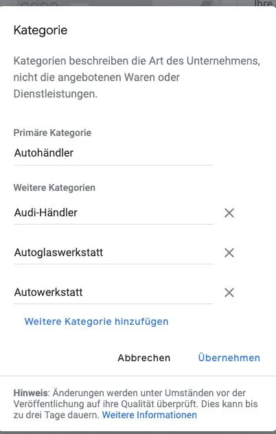 Übertreiben Sie es aber nicht mit den Kategorien. Mehr als 3 oder 4 sollten es nicht sein. Beachten Sie hierbei auch folgendes: Wie Google selbst schreibt, wählen Sie Kategorien so aus, dass die Aussage “Dieses Unternehmen ist ein/e” und nicht “Dieses Unternehmen hat ein/e” zutrifft. Die Kategorien sollten Ihr Unternehmen als Ganzes beschreiben und keine Auflistung der angebotenen Produkte, Services oder sonstigen Leistungen sein. Dies führt uns auch prompt zum zweiten gängigen Fehler.